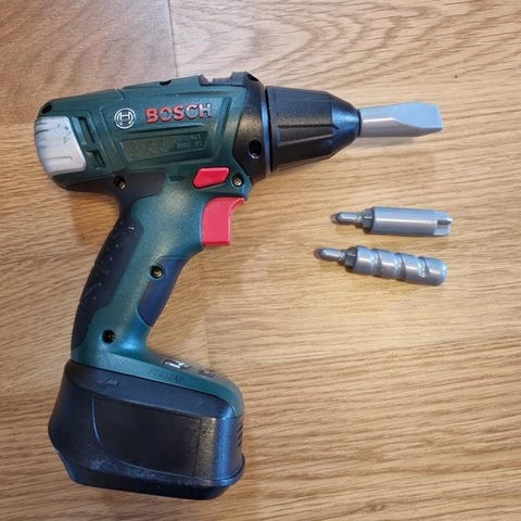 Theo Klein Bosch batteridriven leksaksdammsugare med sug- och ljudfunktion. Vrid- och avtagbart golvmunstycke med rullvals. Lite använd, batterier medföljer.