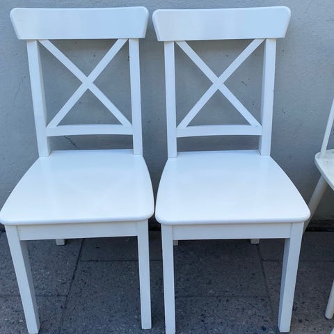 Två stadiga stolar - INGOLF. Den stadiga vita stommen av massivt trä och är lackerad.