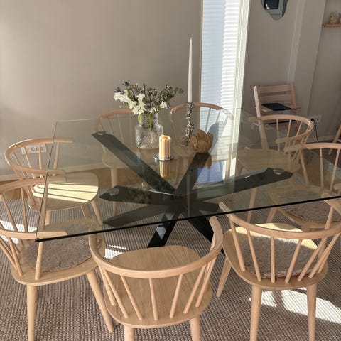 Bra skick glas bord med fyra skin och sköna stolar som kan snurra.