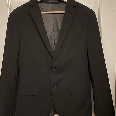 Säljer en kavaj med tillhörande byxor använda en gång. Kavajen st.52 short slim fit. Byxa st. 34/30.