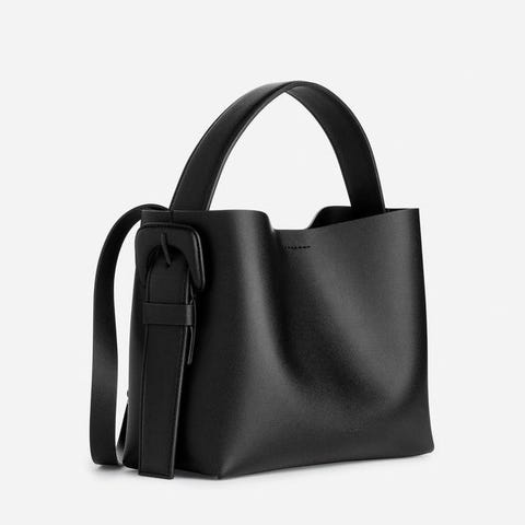 Superfin vit/creme färgad mellanstor axelremsväska i styvt återvunnet läder från Arket.