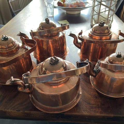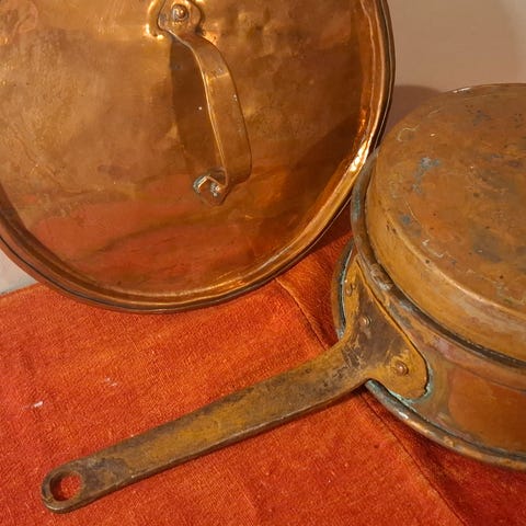 Koppar, 1 spann med lock, 1 stor hink, i kaffepanna, 1 kastrull med lock och några mindre föremål, + 1 Kanna i Mässing med stämpel Gustav Eriksson, Eskilstuna