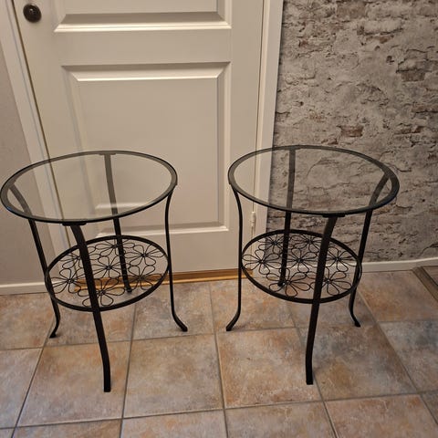 Sängbord ,sidobord , glas från Mio. Fint skick. Hämtas I Norrtälje. 600kr för båda.