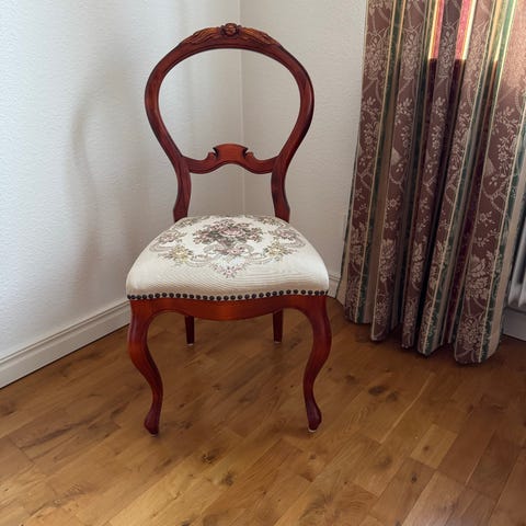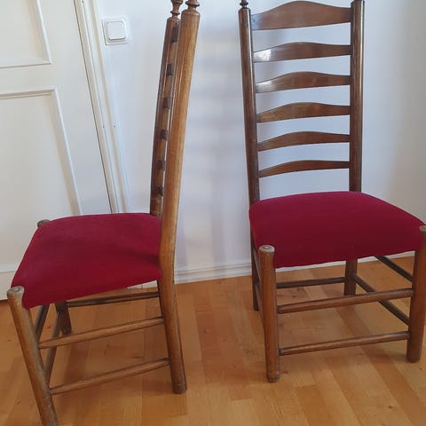 Säljer ett par antika stolar. De har skador, märken, lagningar, lite rangliga, samt saknar en av stolarna en tvärslå. Passar perfekt i ett äldre hem mot väggen som avlastning eller som extra matstolar.