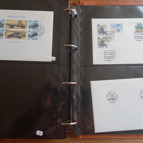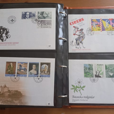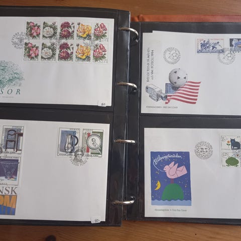 Se bilderna med ett urval av FDC:erna. (Ignorera de små etiketterna på vissa av arken.) Om du har några frågor, kontakta mig gärna.