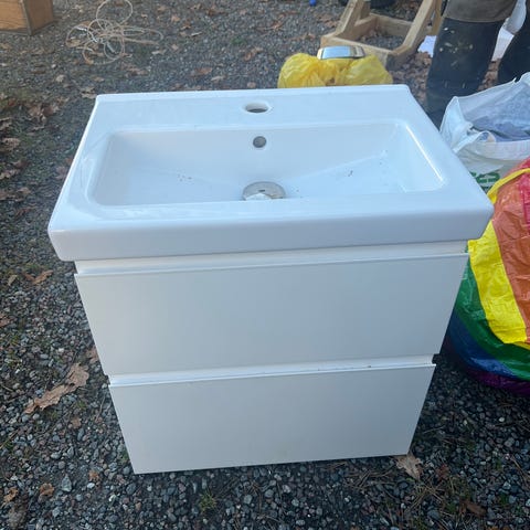 Tvättställ med kommod bestående av ett svart handfat i stenliknande material med guldfärgade inslag och en vit kommod med två lådor. Handfatets mått är cirka 40 cm i höjd och 60 cm i bredd. Kommodens höjd är cirka 56 cm exkl. handfatet,