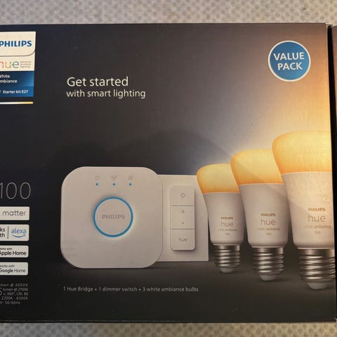 Philips Hue Bridge smart hem belysningskontroller med vit färg och kompakt design. Ansluts via Ethernet och strömkabel för att styra Philips Hue-lampor och tillbehör i ett smart hem-system.
