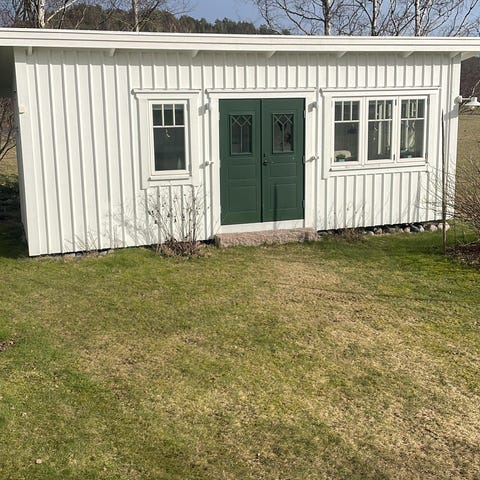 Gäststuga attefallshus byggt i trä med svart panel, gröna fönster och dörrar. Perfekt för övernattning eller ha som förråd / redskapsbod / friggebod.