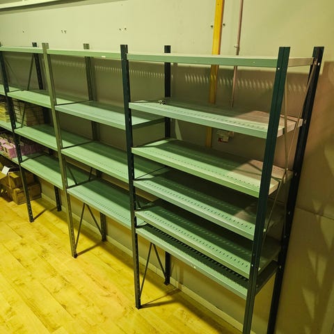 Mycket kraftigt hyllsystem . 7 st hyllplan 1200x600 och 8 st 1200x370mm