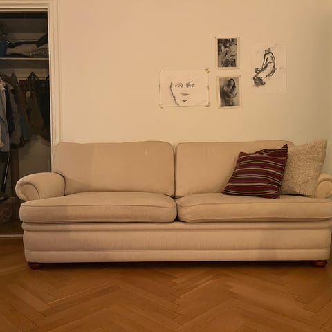 Snygg och bekväm soffa säljes. Något solblekt i tyget, annars mycket fint skick.