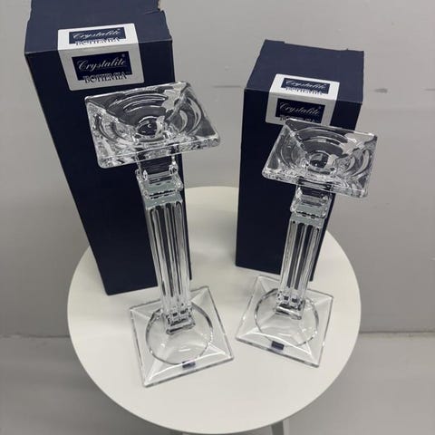 Guldfärgad stomme och äkta kristallprismor. Höjd 35 cm, bredd 20 cm. Tre ljushållare, ljusen ingår inte.