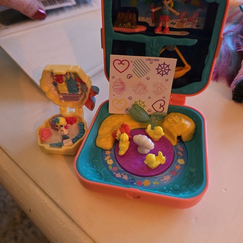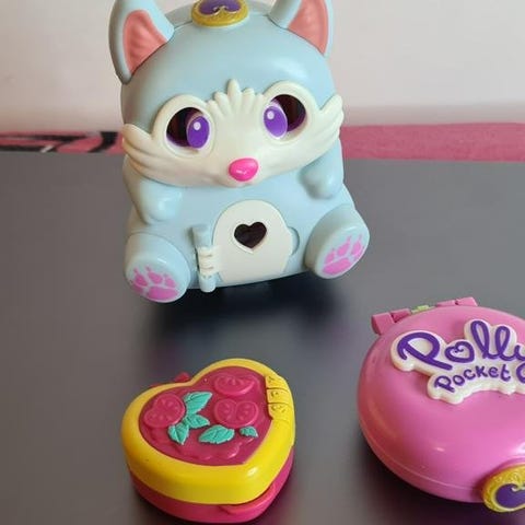 Polly Pocket barnleksak mini lekset formad som en ananas med flera små figurer och tillbehör. Leksetet kan öppnas för att visa en lekplats inuti med olika detaljer och färger.