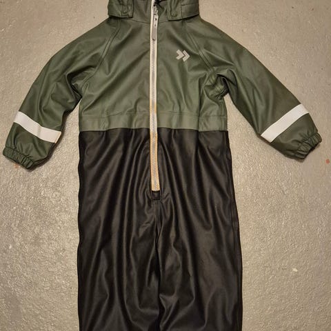 Vind- och vattentät regnoverall. Stängs med dragkedja. Avtagbar huva fäst med tryckknappar. Har reflexer på ben och armar. Overallen är fleecefodrad och reglerbar i midjan. Resår i ärm och benslut. Köpt på Lager 157.