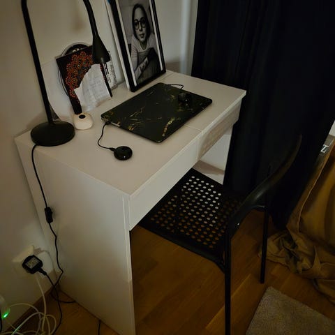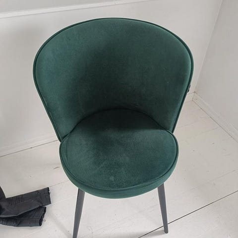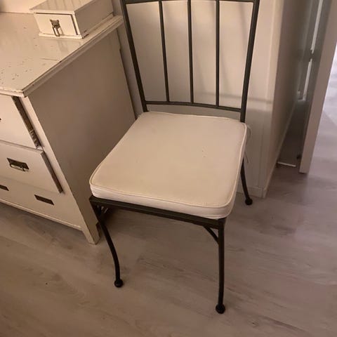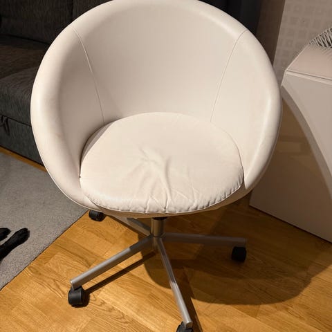 ”Träet” har gått av på ett ställe, se bild. I övrigt vanligt bruksslitage. Funkar som den ska. Perfekt stol för sminkbordet tex.