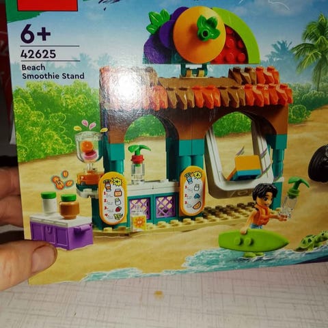 Flera lego friends, lego city och lego junior legosatser: en motorcykel, en scooter, ett tigertempel, ett djursjukhus, en strandbil och en strandvakt.