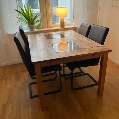 Matbord i ek med 3st granitskivor säljes tillsammans med 4st stolar, även dem i ek med läderrygg och sits.