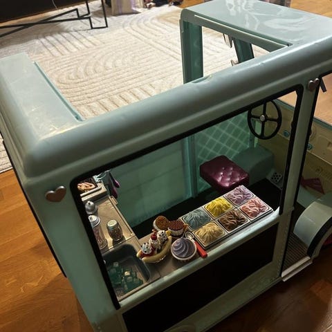 Bilen har öppningsbar dörr, serveringslucka på sidan och en stor glass-dekoration på taket. Perfekt för barn som gillar rollekar och fantasilek.