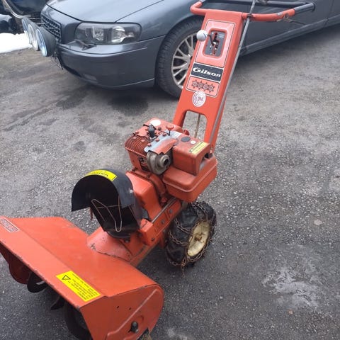Tvåtakt tecumseh motor på 90 kubik har nog ork för det mesta på garageuppfarten. Bruksskick med renoverad förgasare, reglerbart sidoutkast höger och vänster. Två nycklar. Ett par små skönhets-skavanker då den har några år på nacken.
