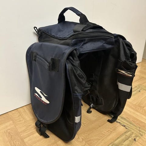 Väskan rymmer två liter. Fästes på toppröret. Ca 50 cm lång. Några systygn behövs i sidofacket. Kan ev. skicka.