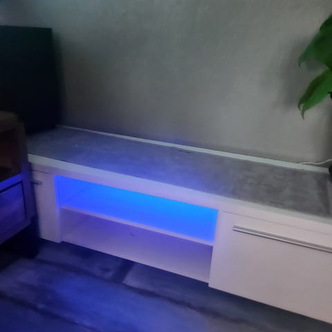 Vägghängd TV Bänks Set, Etanolkamin med förvaring på båda sidorna och en mindre separat hylla för förvaring.