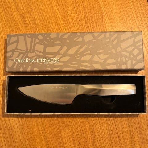 Innehåller 6 st olika köksknivar. Den andra kniven uppifrån har använts en gång men är självklart diskad & ren. Saknar dock det lilla plastskyddet för spetsen som finns på resterande knivar. Finns en tillhörande skärbräda som också är helt oanvänd men dock graverad, man väljer själv ifall man vill ha med den eller inte.