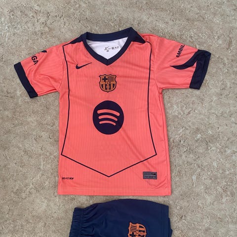 Nike Barcelona fotbollströja och shorts för barn i blå och röd färg. Setet inkluderar tröja med nummer 10 och namn "Lamine Yahia" på ryggen samt matchande shorts med Barcelonas klubbmärke.