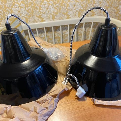 Säljer 2 pendellampor i svart glas, vita inuti.
