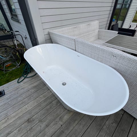 Lejontass badkar,sparsamt använt då det varit monterat i ett gästhus.Längd 153cm,bredd 60cm i mitten och 70cm bred längre upp.Höjd 76cm.