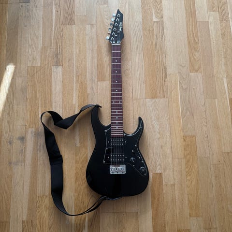 En elgitarr som inte är av nåt känt märke Hade lite otur när jag bar den så tappade jag den i marken så den blev lite skadad som ni ser på två bilderna.