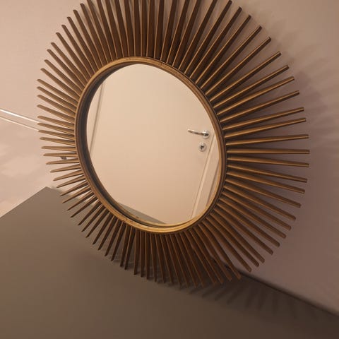 Spegel med kopparfärgad ram och upphängningskedja.