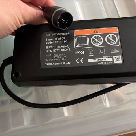 Batteriladdare från Yamaha, modell PASC5 X0S-00 med utgång 42V 4A. Har fast kabel med rund flerpolig kontakt och tydlig etikett med specifikationer.