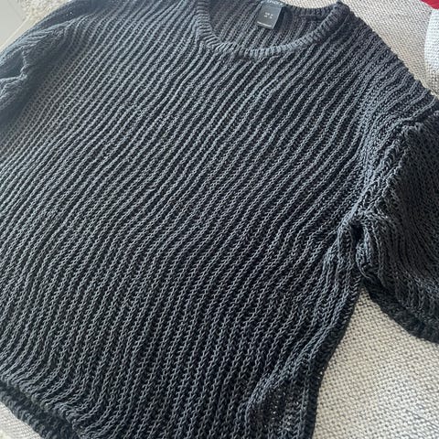 Svart, kortärmad topp med fyrkantig halsringning och rynkade detaljer. Storlek snarare M