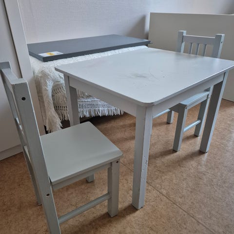 Väl använt skick, större märke på bordsskiva och kantstötta pallar (se bild)