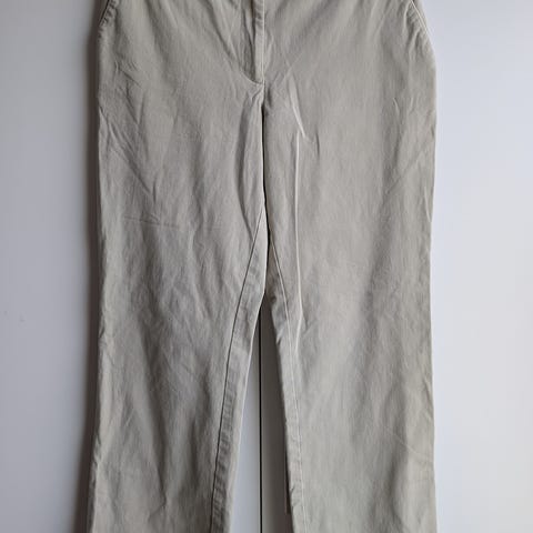 Beige byxor med knappar i midjan och fickor. Byxorna har en rak passform. Bomull och polyester
