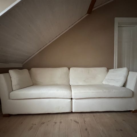 Soffan inköpt begagnad 2021 och har ett synligt slitage. Även överdraget är slitet och har hål.