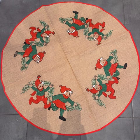 En exklusiv stjärn-formad Julgrans-matta sydd i mörk-rött chintzat tyg och ett blommigt med rött, grönt, vitt o guld. Julgransmattan är vadderad och undersidan är i ett rent mörkrött bomullstyg. Tvättas i fintvätt/ylle, torktumlas inte.