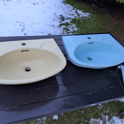 En ljusblå och en ljusgul retro bidé, mycket fint skick.