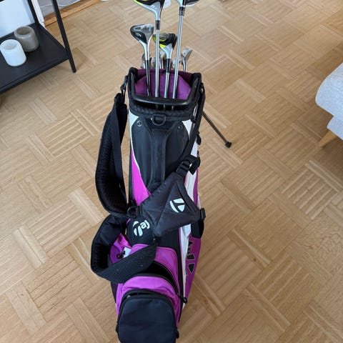 TaylorMade golfbag i svart och vit färg med flera fickor och bärremmar. Passar för att bära och förvara golfklubbor och tillbehör under golfspel.