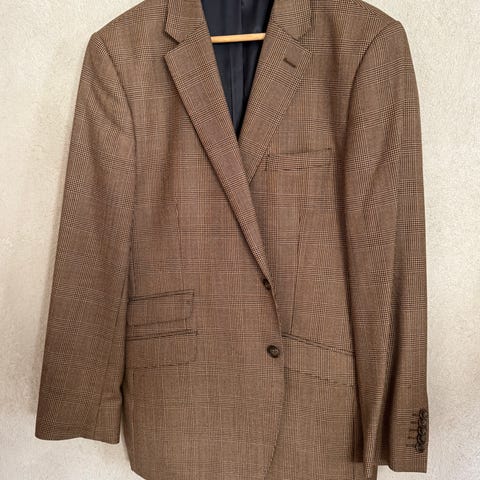 Kavajen har fiskbensmönster, bruna armbågslappar, en svart innerfoder och stängs med två knappar framtill. Det finns tre knappar vid ärmsluten.