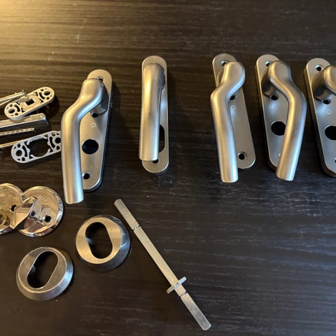 Habo dörrhandtag i krom, inklusive monteringsdetaljer. Handtagen har en L-formad design och är avsedda för dörrar. Levereras i originalförpackning. 250 kr st finns 8 st handtag