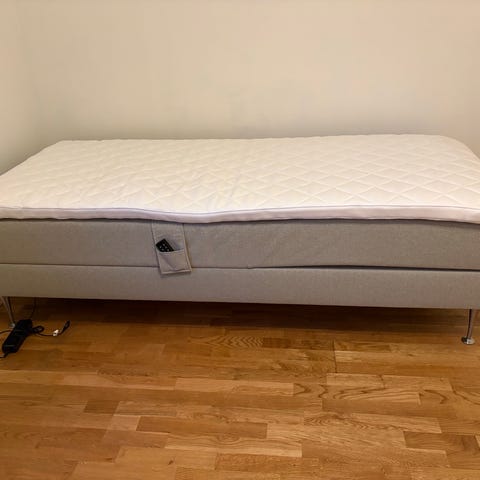 Säng 90x200 med elektrisk ribbbotten (ställbar) som knappt är använd. Den har en helt ny ram från IKEA (HEMNES) som är köpt för att det är den enda ramen som passar att ha en ställbar madrass. Bara denna kostar 2595kr. Bäddmadrassen är inte mycket använd.