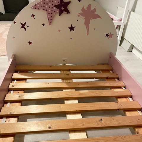 90-säng med 22 cm resårmadrass med bra stuns och metallben.