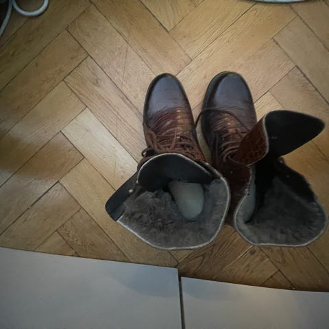 Moon boats. Kanske storlek 43. Jag har ägt dom sedan 1978 och jag kan inte minnas att jag någonsin använt dom. Klart unika. Ser nu att många andra är betydligt dyrare så jag ändra från 1200:- till 1800:-