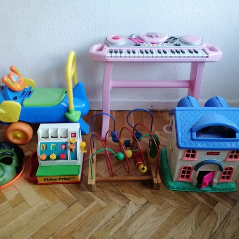 Fisher-Price Little People barnleksaker inklusive olika modeller som stapelleksak med färgglada ringar, leksaksmaskin med knappar och ljud, samt bilbana med små bilar. Leksakerna är tillverkade i plast och är avsedda för småbarn.
