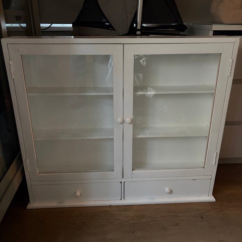 Ett elegant väggskåp inköpt på Mio. Kan till exempel placeras ovanför TV eller i martum. Passar olika inredningsstilar.