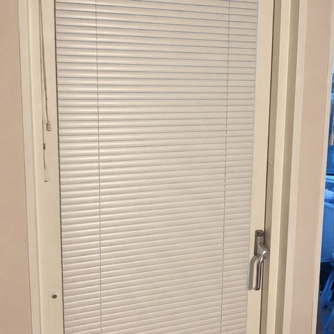 Persienner i aluminium med vit färg. Inkluderar monteringsdetaljer och snören för justering. Passar fönster och kan användas för ljusreglering och insynsskydd.