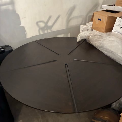 Betsat bordskiva med vitlackerade kryssade ben. Finns en liten smal spricka på ena benet.
