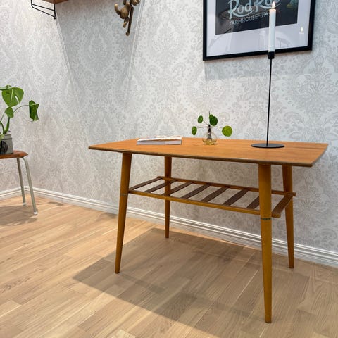 Vackert designat soffbord i teak med underliggande tidningshylla. 60-tal när det är som bäst. Bordet är i mycket bra skick, stabilt och med mässingsfästen för tidningshyllan. Det är använt och har några skavanker på bordskivan. Jag har valt att inte slipa och olja det för vet att många vill ha det i original.