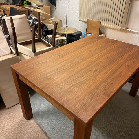 Matbord i valnöt med 6 skinnstolar