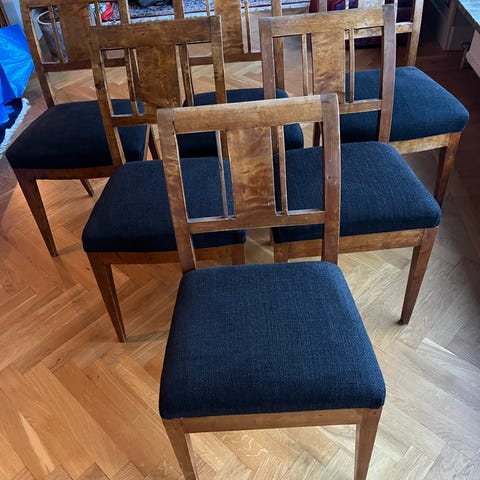 Ett par vackra stolar 1900-tal i original. Svarta med guldbemålning och stoppad sits, klädsel med pärlspik. Sitthöjd 45 cm total höjd 87 cm